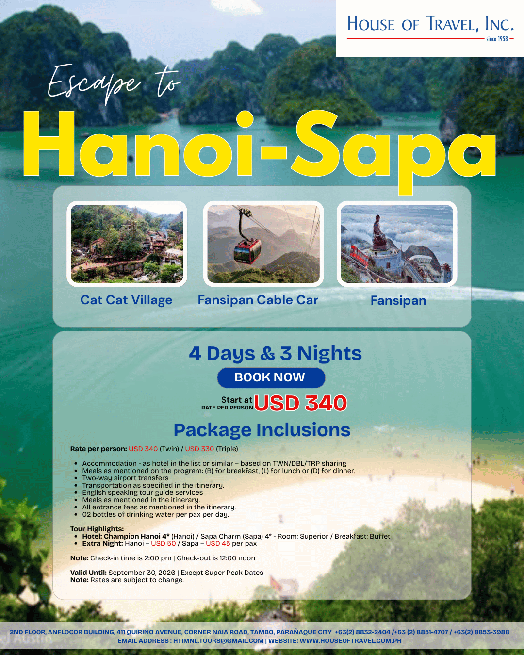 Extra Night: Hanoi – USD 50 / Sapa – USD 45 per pax